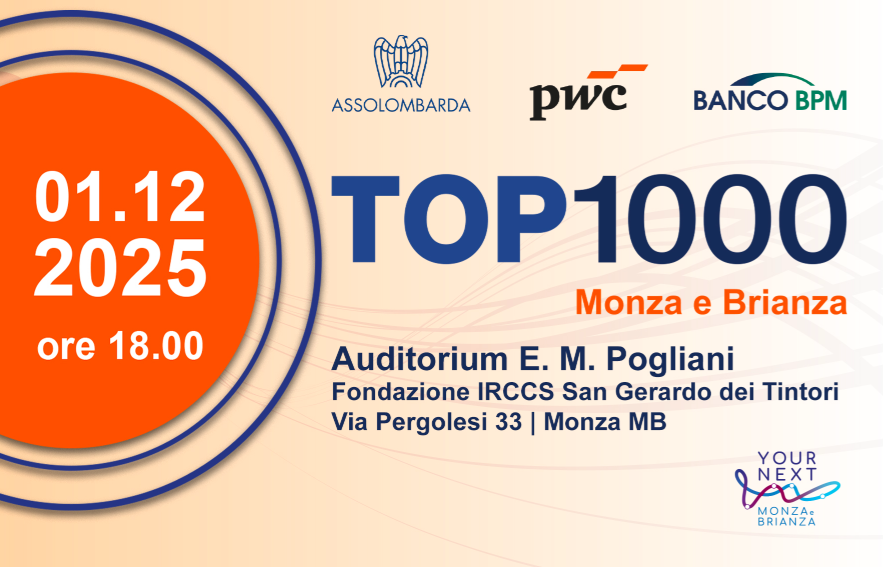 Lunedì 1 dicembre 2025 alle ore 17.30 si terrà presso l'Auditorium E. M. Pogliani la nuova edizione di TOP 1000 Monza e Brianza, l’appuntamento annuale che fornisce una panoramica delle realtà imprenditoriali della provincia di Monza e Brianza, con una visione prospettica sugli andamenti economici e sulle prossime sfide. Nel corso dell'evento, organizzato da Assolombarda, in collaborazione con PwC Italia, Banco BPM e Il Cittadino di Monza e Brianza, verranno presentati i dati della ricerca a cura del Centro Studi di Assolombarda sulle prime 1000 imprese della provincia. L’incontro sarà inoltre l’occasione per approfondire insieme a istituzioni, associazioni e imprenditori locali le sfide e le opportunità legate alla capacità delle aziende di trattenere i talenti e attrarre le nuove generazioni in un mercato in continua evoluzione e le strategie per rendere il territorio sempre più attrattivo, competitivo e capace di valorizzare il capitale umano. La partecipazione è gratuita previa registrazione. Per iscriversi all’evento cliccare qui.