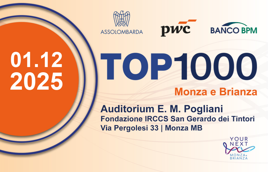 Lunedì 1 dicembre 2025 alle ore 16.45 si terrà presso l'Auditorium E. M. Pogliani la nuova edizione di TOP 1000 Monza e Brianza, l’appuntamento annuale che fornisce una panoramica delle realtà imprenditoriali della provincia di Monza e Brianza, con una visione prospettica sugli andamenti economici e sulle prossime sfide. Nel corso dell'evento, organizzato da Assolombarda, in collaborazione con PwC Italia, Banco BPM e Il Cittadino di Monza e Brianza, verranno presentati i dati della ricerca a cura del Centro Studi di Assolombarda sulle prime 1000 imprese della provincia. L’incontro sarà inoltre l’occasione per approfondire insieme a istituzioni, associazioni e imprenditori locali le sfide e le opportunità legate alla capacità delle aziende di trattenere i talenti e attrarre le nuove generazioni in un mercato in continua evoluzione e le strategie per rendere il territorio sempre più attrattivo, competitivo e capace di valorizzare il capitale umano. La partecipazione è gratuita previa registrazione. Per iscriversi all’evento cliccare qui.